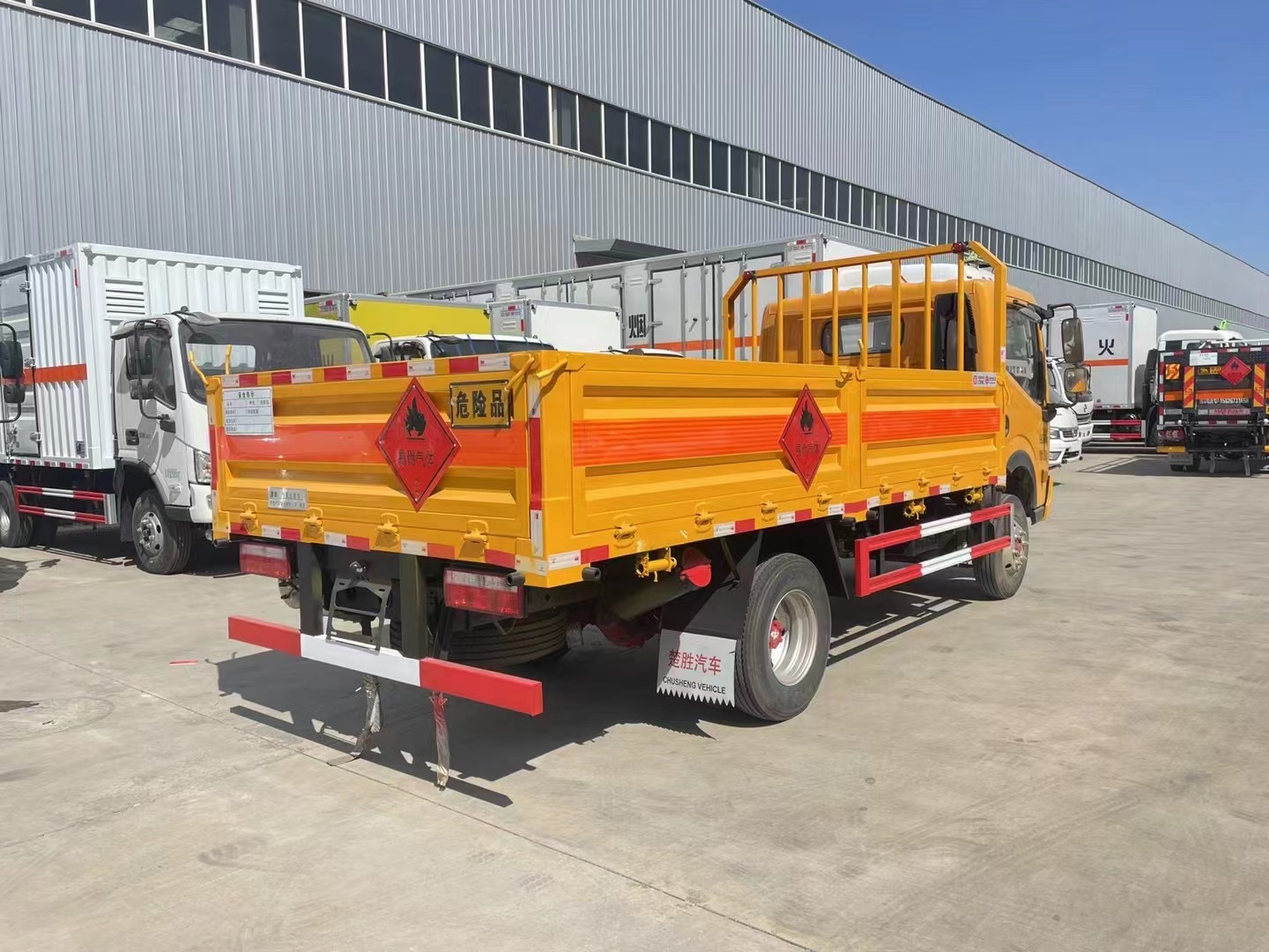 廂體邊板采用1.2mm冷板,底板標配3mm花紋鋼板,花欄及花欄立柱可拆卸,底部立柱固定,底板上方鋪靜電膠皮,底板均做防銹處理,車廂一周粘貼橙色反光帶,箱體粘貼菱形標志牌,安全告示牌,危險品牌,拖地靜電帶。