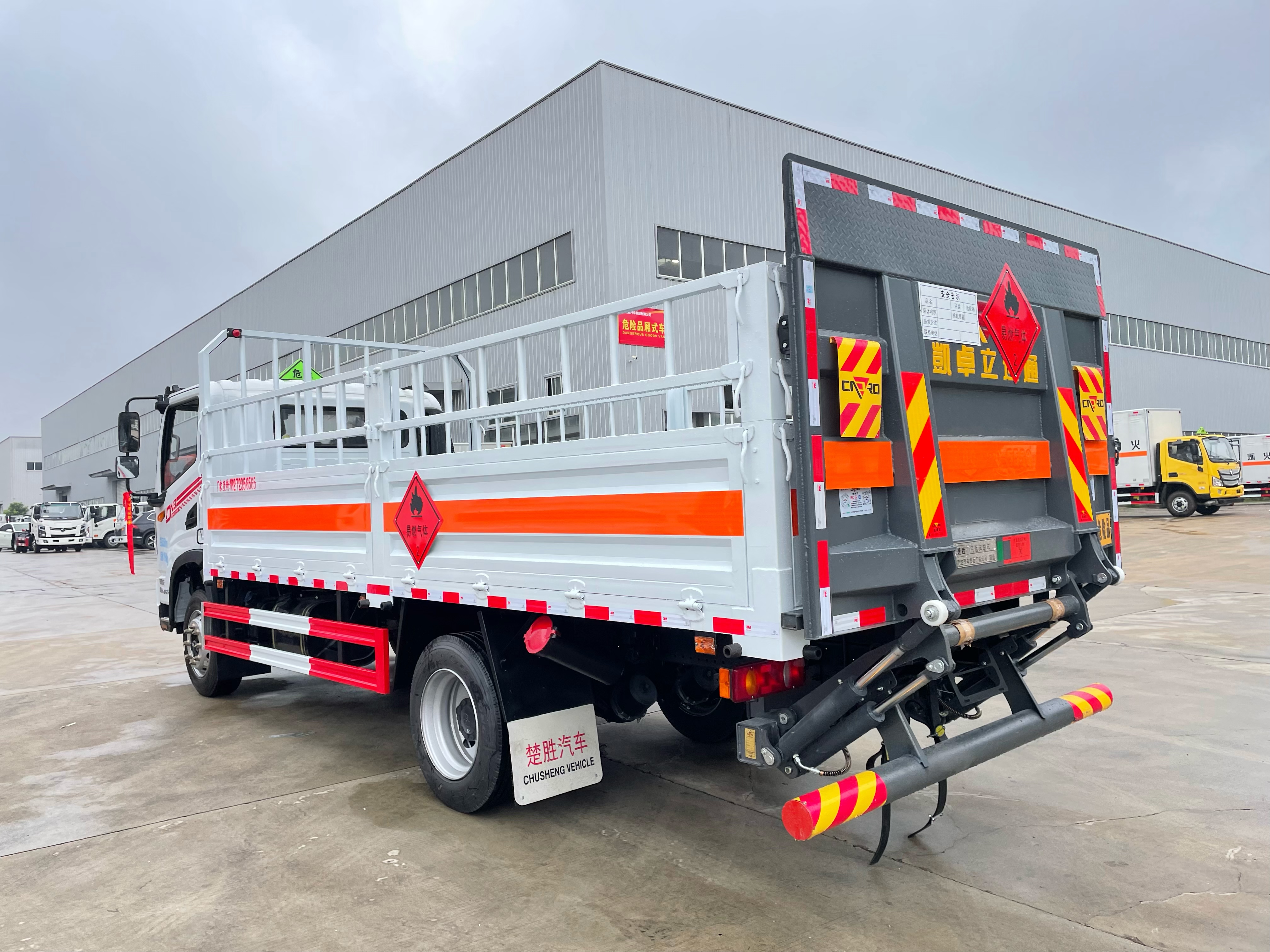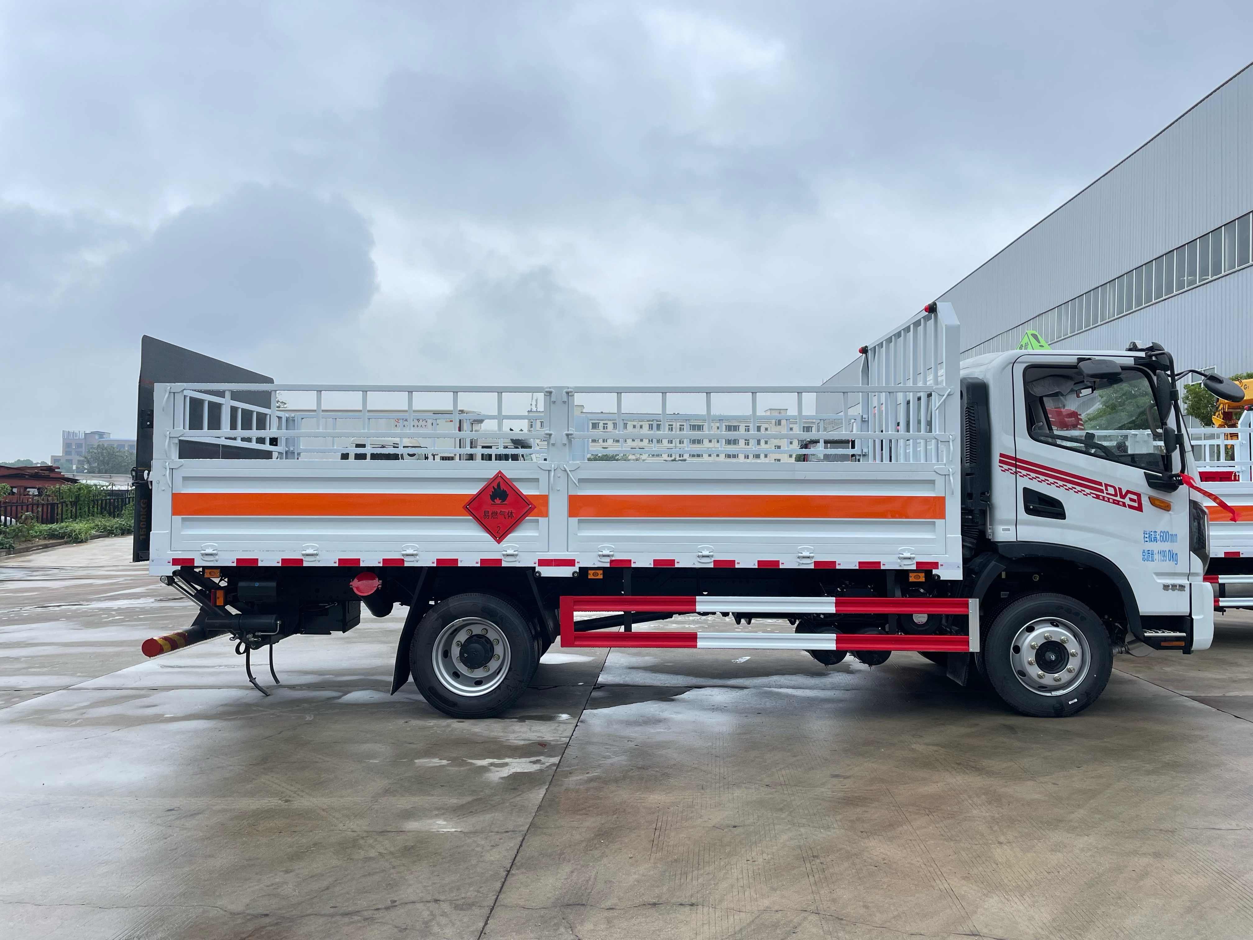 廂體邊板采用1.2mm冷板,底板標配4mm花紋鋼板,花欄及花欄立柱可拆卸,底部立柱固定,底板上方鋪靜電膠皮,底板均做防銹處理,車廂一周粘貼橙色反光帶,箱體粘貼菱形標志牌,安全告示牌,危險品牌,拖地靜電帶。