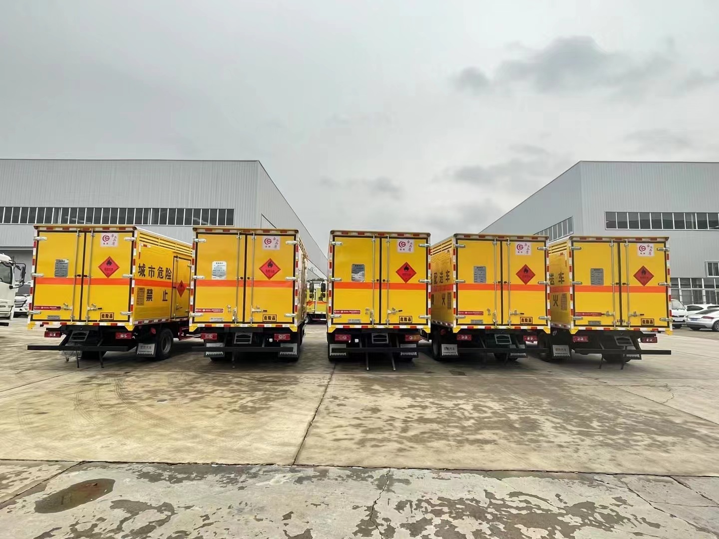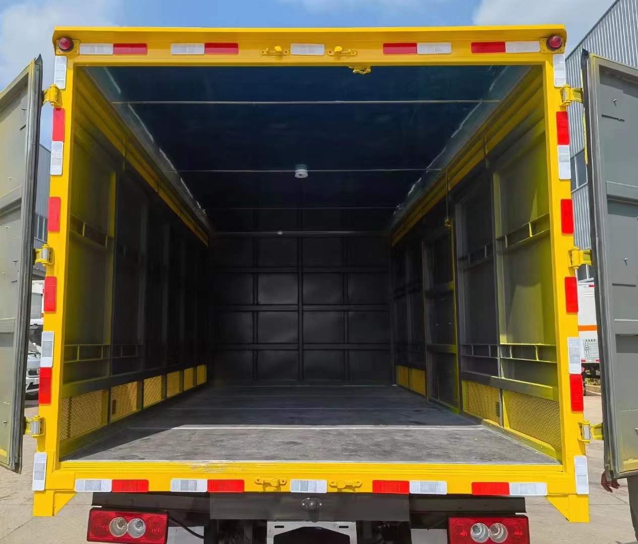 嚴(yán)格按照公告尺寸制作。外板采用烤漆板帶百葉窗,內(nèi)飾為導(dǎo)電性能良好的鋁平板有透氣孔,矩形骨架結(jié)構(gòu)內(nèi)部填充防火阻燃材料,復(fù)合加鉚合工藝。廂體四周鋁合金包邊及包角,車廂底板3mm鋪設(shè)防靜電膠皮,廂體前臉50公分高鋪設(shè)防靜電膠皮。后部設(shè)置對(duì)開門,右側(cè)單開門,廂體內(nèi)部兩側(cè)安裝捆綁貨物的臥環(huán)。廂體內(nèi)部安裝煙霧報(bào)**器及防盜報(bào)**感應(yīng)器。車廂一周粘貼橙色反光帶,箱體粘貼 菱形標(biāo)志牌,安全告示牌,危險(xiǎn)品牌,箱體安裝示廓燈(前白后紅),拖地靜電帶。